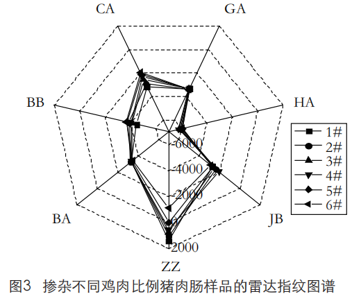 為了更直觀地將不同摻雜雞肉比例的豬肉腸樣品的信號強度進行對比分析,利用Astree軟件將摻雜不同雞肉比例的豬肉腸樣品在7根不同傳感器下的響應強度峰值平均分布在圓周上,并描點成一個雷達指紋圖譜,如圖3所示。其中,各樣品編號的摻雜雞肉比例為:1#.0%,2#.20%,3#.40%,4#.60%,5#.80%,6#.100%。