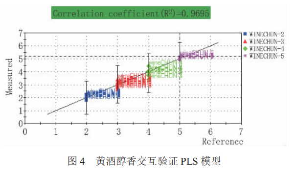 偏最小二乘法(PLS,Partial Least Squares)是通過訓練樣品建立定量模型,在描述定量信息后,選擇適合的傳感器, 可以用來對未知樣品進行定量分析或預測評分的分析方法。實驗中隨機抽取 2、3、4、5 分值的酒樣共計18 份為未知樣品, 然后以其余分值的樣品為基礎建立PLS 定量模型,見圖 3。