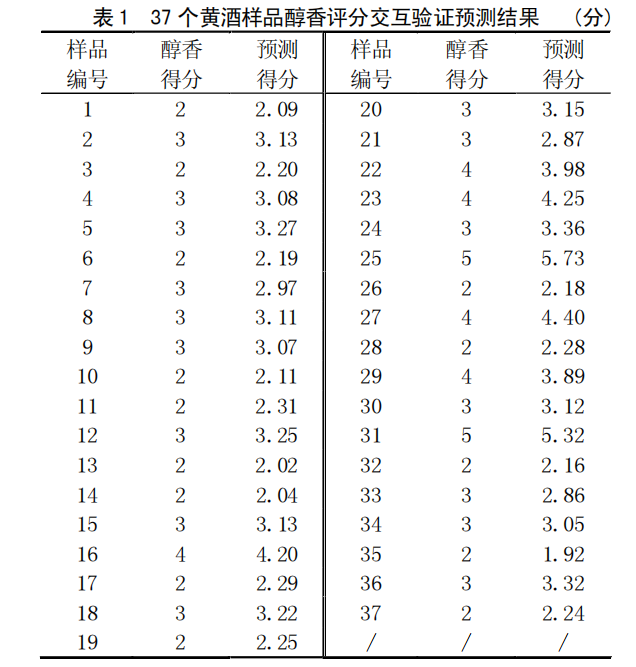 從表 1 可以看出, 所有樣品的醇香得分經交互驗證顯示,驗證準確率為 97.3 %。其中 25 號樣品醇香分值為5 分的酒樣,其預測得分略高,查得此樣品為 40 年陳釀,而 31 號樣品醇香分值為 5 分,預測結果相對接近,查得此樣品為 20 年陳釀。這可能是由于二者年份上的差異加上評分機制最高為 5 分,而導致預測結果略有偏離。在實際感官品評時,不影響其得到最高分值。