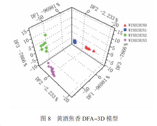 實驗中選取的 37 個酒樣中有 10 個酒樣具有不同程度的焦香。將不同分值的酒樣分組賦值后,得到黃酒中焦香的 DFA 模型,見圖 8。