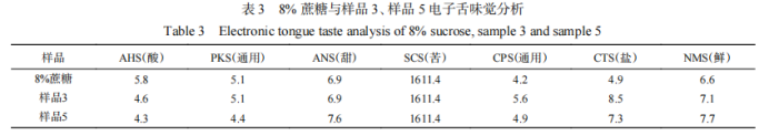 2.電子舌味覺分析(表3)得到樣品3和8%蔗糖溶液的甜度相似。