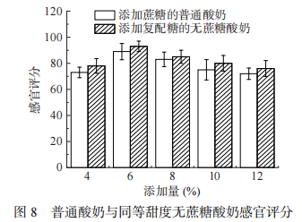 添加復配糖的無蔗糖酸奶和添加蔗糖的普通酸奶感官評分如圖8所示。添加6%蔗糖的普通酸奶感官評分89,同等甜度下添加復配糖的無蔗糖酸奶感官評分93,評分較其它濃度的酸奶高。同等甜度下,4%蔗糖和復配糖添加量過少不足以掩蓋酸奶發酵過程中的酸味,但組織狀態良好;同等甜度下,8%、10%、12%蔗糖和復配糖添加量過高,滋味過甜。添加量過高會影響到酸奶的凝乳效果,延長發酵時間,有少量乳清析出,出現組織狀態不好的現象。6%的添加量,酸奶酸甜可口,且發酵時間適宜,組織狀態均勻,滋味氣味良好。