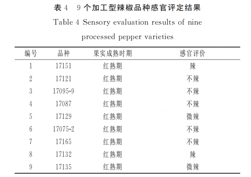 在國際上用斯科維爾指數來表示辣感強弱的量化值,本試驗的感官評定結果是根據 GB/T21265-2007方法進行鑒定所得,將結果分不辣、微辣、辣和超級辣4種情況,其原理是利用乙醇提取測試樣品中的辣椒素類物質,然后過濾,將該提取液制成不同辣椒素濃度的糖水溶液,通過感官分析品評。