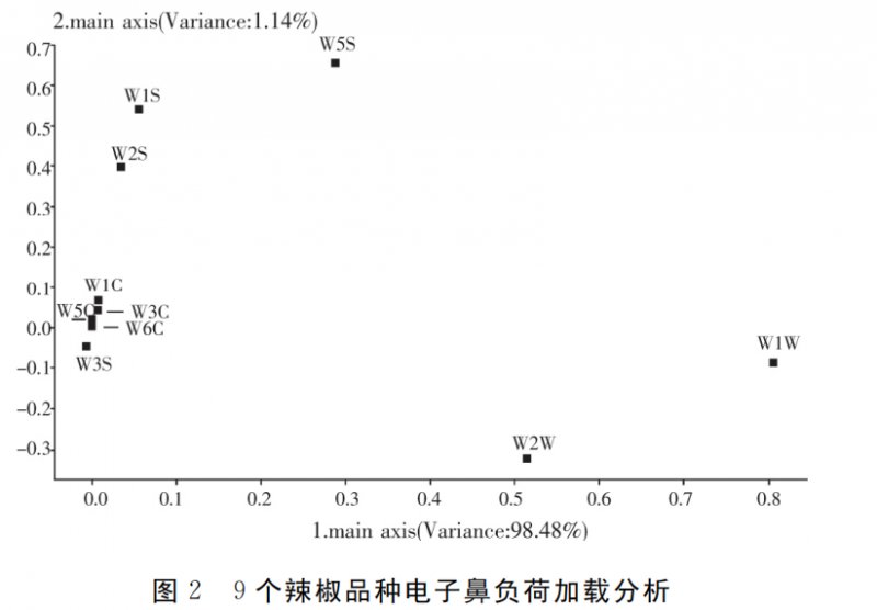 負荷加載分析(Loadings)與 PCA 分析是相關的,基于同一種算法,區別在于 Loadings分析是針對電子鼻傳感器貢獻率進行研究。電子鼻共有10個傳感器,不同傳感器可以反映樣品中揮發性氣味的響應值,傳感器數值離原點越遠,說明該傳感器識別能力越強,反之則越弱。由圖2可知,在第一主成分中,W1W 傳感器識別作用最強,其次是 W2W 傳感器,這2個傳感器與其余傳感器相比,距原點的距離明顯較遠,識別能力強。在第二主成分中,W5S傳感器距原點距離明顯遠于其余傳感器,綜合來看,W5S、W1W、W2W 傳感 器對9 種辣椒品種的辣度評價起到了主要作用,這與圖1中的辣度均值分析結果相吻合。