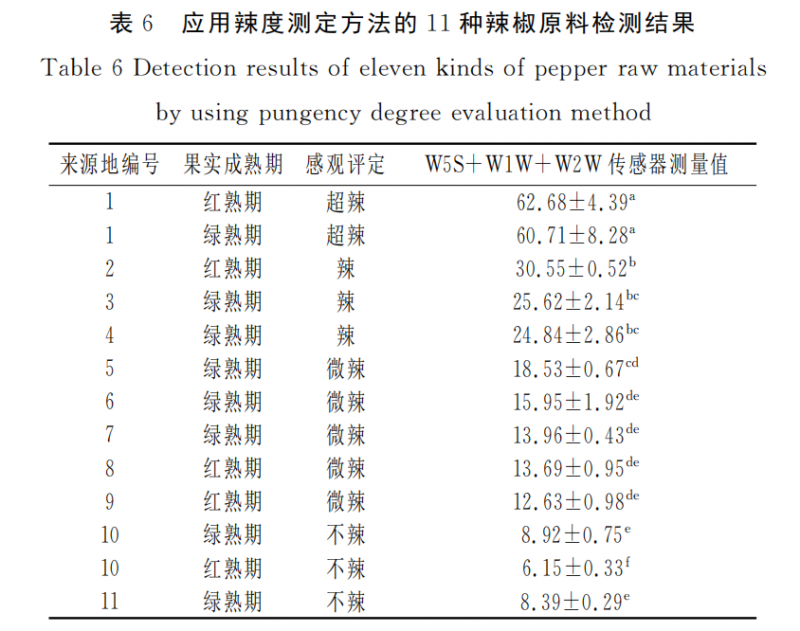 由表6可知,11種辣椒原料存在顯著性差異,說明利用電子鼻可以有效區分辣椒品種。且所有紅熟期辣椒、所有綠熟期辣椒和同一品種紅綠果辣椒辣度測定結果均與上述結果吻合:感官評價為不辣的辣椒原料,其 W5S、W1W、W2W 數值之和在1~10之 間;感官評價為微辣的辣椒原料,其 W5S、W1W、W2W 傳感器辣度值之和在10.1~20之間;感官評價為辣的辣椒原料,其 W5S、W1W、W2W 傳感器辣度值之和在20.1~50,其中,魔鬼椒的 W5S、W1W、W2W 傳感器辣度值之和大于50.1,評定為超辣,證明電子鼻測定辣椒辣度的可行性。