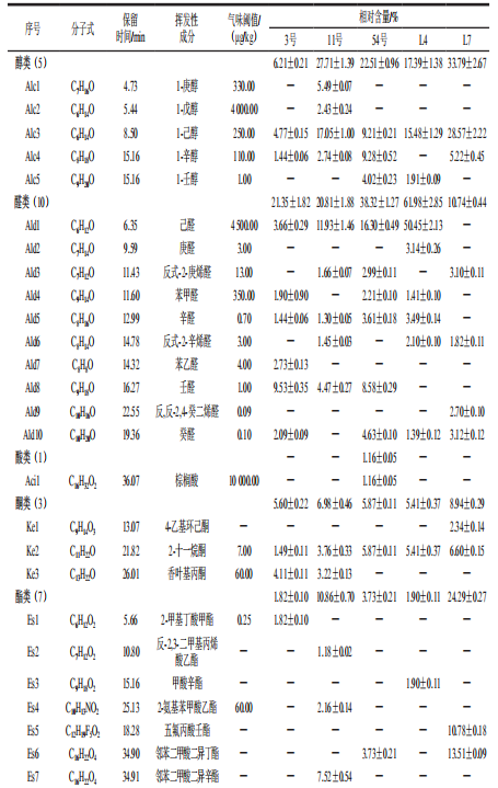 金針菇品種繁多,并且各種新品種不斷研發(fā)栽培。不同品種金針菇的生長特性、出菇特性、商品性狀和生物轉(zhuǎn)化率不同,而風(fēng)味物質(zhì)也存在各自的差別和獨特之處。本研究采用SPME-GC-MS和電子鼻分析5個品種金針菇揮發(fā)性物質(zhì),由定量分析、PCA、HCA探究不同品種金針菇揮發(fā)性物質(zhì)差異,并通過SPME-GC-MS結(jié)合電子鼻進(jìn)行PCA對比品種鑒定準(zhǔn)確率。 5個金針菇樣品組(3號、11號、54號、L4和L7),測定前將樣品用液氮研磨。 GC-MS聯(lián)用儀;FOX3000型電子鼻。 金針菇風(fēng)味化合物SPME-GC-MS檢測 用液氮研磨后,準(zhǔn)確地稱量2.0g金針菇樣品于20mL頂空瓶中。將DVB/CAR/PDMS型萃取頭在250℃活化20min后,在60℃水浴中進(jìn)行靜態(tài)吸附萃取40min,將萃取頭放入GC進(jìn)樣口解吸。 以正構(gòu)烷烴的實際測量值校正保留時間,SPME-GC-MS測定結(jié)果通過NIST98數(shù)據(jù)庫(NIST08,華盛頓特區(qū))進(jìn)行檢索,取匹配度80%以上的揮發(fā)性成分;以2-氯苯甲醛為內(nèi)標(biāo)物對各化合物進(jìn)行定量分析。 用液氮研磨后,精確稱取2.0g金針菇樣品于20mL頂空瓶內(nèi)。樣品測量流速150mL/min,檢測時間120s。電子鼻配備12個不同的氣體傳感器:LY2/LG、LY2/G、LY2/AA、LY2/GH、LY2/gCTL、LY2/gCT、T30/1、P10/1、P10/2、P40/1、T70/2和PA/2,通過傳感器陣列響應(yīng)和模式識別技術(shù)對揮發(fā)性氣體分子進(jìn)行分析。 利用相對氣味活度值(relativeodoractivityvalue,ROAV)評定各揮發(fā)性化合物對樣品總體氣味的貢獻(xiàn),定義對樣品風(fēng)味貢獻(xiàn)最大的組分:ROAVstan=100,則其他揮發(fā)性化合物的ROAV小于100,按下式計算: