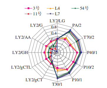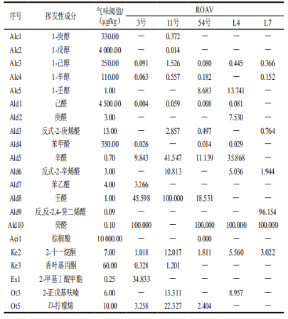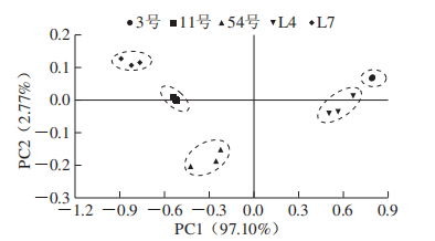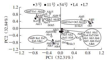 式中:Cri、Ti分別為各揮發(fā)性化合物的相對含量/%和氣味閾值/(μg/kg);Crstan、Tstan分別為對樣品風(fēng)味貢獻(xiàn)最大組分的相對含量/%和氣味閾值/(μg/kg)。 ROAV≥1的物質(zhì)為該品種金針菇的特征揮發(fā)性物質(zhì);0.1≤ROAV<1的物質(zhì)對該品種金針菇整體風(fēng)味有修飾作用,且ROAV越大說明該物質(zhì)對該品種樣品總體風(fēng)味貢獻(xiàn)越大。 不同品種金針菇揮發(fā)性物質(zhì)的SPME-GC-MS分析 如表1所示,5個品種金針菇樣品中共檢測出53種揮發(fā)性成分,3號、11號、54號、L4和L7分別檢測出21、29、21、12種和18種成分,其中醇類、醛類和芳香烴類占總含量的60%~95%。不同品種金針菇僅有2種共有揮發(fā)性成分,分別為1-己醇和2-十一烷酮。每種金針菇都有3種或3種以上其他品種中不存在的化合物,3號、11號、54號、L4和L7中特有化合物數(shù)量分別為3、12、3、4種和4種。 表1 不同品種金針菇樣品中揮發(fā)性化合物的相對含量 如表2所示,辛醛、苯乙醛、壬醛、癸醛、2-十一烷酮、2-甲基丁酸甲酯、D-檸檬烯為3號金針菇的特征揮發(fā)性物質(zhì)(ROAV≥1),香葉基丙酮對3號金針菇的整體風(fēng)味起修飾作用(0.1≤ROAV<1);1-己醇、反式-2-庚烯醛、辛醛、反式-2-辛烯醛、壬醛、2-十一烷酮、香葉基丙酮、2-正戊基呋喃、D-檸檬烯為11號金針菇的特征揮發(fā)性物質(zhì)(ROAV≥1),1-庚醇、1-辛醇對11號金針菇的整體風(fēng)味起修飾作用(0.1≤ROAV<1);1-壬醇、辛醛、壬醛、癸醛、2-十一烷酮、D-檸檬烯為54號金針菇的特征揮發(fā)性物質(zhì)(ROAV≥1),1-辛醇、反式-2-庚烯醛對54號金針菇的整體風(fēng)味起修飾作用(0.1≤ROAV<1);1-壬醇、庚醛、辛醛、反式-2-辛烯醛、癸醛、2-十一烷酮、2-正戊基呋喃為L4金針菇的特征揮發(fā)性物質(zhì)(ROAV≥1),1-己醇對L4金針菇的整體風(fēng)味起修飾作用(0.1≤ROAV<1);反式-2-辛烯醛、反,反-2,4-癸二烯醛、癸醛、2-十一烷酮為L7金針菇的特征揮發(fā)性物質(zhì)(ROAV≥1),1-己醇、1-辛醇、反式-2-庚烯醛對L7金針菇的整體風(fēng)味起修飾作用(0.1≤ROAV<1)。 5種金針菇中共檢測出5種醇類化合物,存在于4個品種金針菇中的1種,是1-辛醇,1-庚醇和1-戊醇均只在11號金針菇中被檢測到。 5種金針菇中共檢測出10種醛類化合物,在4種金針菇中被檢測到的有3種,分別為己醛、辛醛和癸醛,庚醛、苯乙醛和反,反-2,4-癸二烯醛分別是L4、3號和L7金針菇中特有化合物。酸類化合物只在54號金針菇中被檢測到,5種金針菇中共檢測出7種酯類化合物。其中只有鄰苯二甲酸二異丁酯存在于2種金針菇中,其他6種化合物均屬于特有化合物。5種金針菇中共檢測出3種酮類化合物,共有的1種,為2-十一烷酮。 5種金針菇中共檢測出6種烷烴類化合物,特有化合物2種,分別為壬烷和2,6,10,14-四甲基十六烷。 5種金針菇中共檢測出5種其他類化合物,獨有化合物有2種,分別為2-甲基-2-(1-甲基乙基)環(huán)氧乙烷和4,5,6,7-四氫-3,6-二甲基-苯并呋喃。 表2 不同品種金針菇樣品中揮發(fā)性成分及對應(yīng)的ROAV 為了顯示5個品種金針菇樣品組中53種揮發(fā)性成分的差異,使用PCA對SPME-GC-MS進(jìn)行分析。如圖1所示,前2個主要成分的貢獻(xiàn)率是85.15%;PC1占52.31%,PC2占32.84%。PC1和PC2都明確區(qū)分了不同品種,5個樣本組相互之間很好地分開,說明不同品種金針菇間揮發(fā)性風(fēng)味相互獨立,且這2個主成分可代表樣品風(fēng)味的主要特征。所有的揮發(fā)組分根據(jù)不同品種樣品組也同樣明顯地區(qū)分開,其中,54號金針菇樣品組與12種化合物分布重疊,11號金針菇樣品組與4種化合物分布重疊。而其他3個品種樣品組雖然沒有與化合物重疊,但四周都有各自相關(guān)的化合物。然而還是有很多比較分散的化合物,處于不同品種之間。這表明盡管使用53種揮發(fā)性化合物也可以將品種區(qū)分開,但是金針菇的揮發(fā)性風(fēng)味物質(zhì)較復(fù)雜,并且在不同品種中有許多相似的物質(zhì),因此僅用SPME-GC-MS判別不同品種金針菇風(fēng)味較為局限。 圖1 不同品種金針菇樣品基于SPME-GC-MS的PCA 為了進(jìn)一步分析SPME-GC-MS對于不同品種金針菇揮發(fā)性風(fēng)味成分區(qū)分情況,將SPME-GC-MS數(shù)據(jù)進(jìn)行HCA,結(jié)果如圖2所示。從圖2可以看出,不同品種金針菇揮發(fā)性成分的聚類樹狀圖顯示出3個主要類別。其中,11號、54號和L7的樣品被歸為一類,而L4和3號的樣本被分別歸為其余兩類。在第一大類中,11號和54號的樣品在最小距離水平上首先聚類,這說明二者的樣品揮發(fā)性成分相似度很高。隨著歐式距離的增加,L7的樣品也并入到這一類中。而當(dāng)歐式距離增加至13時,L4與11號,54號和L7的樣品歸為一類。隨著歐式距離的繼續(xù)增大,當(dāng)增至25時,三大類才歸為一類。這與2.1.2節(jié)結(jié)果一致。HCA差異主要由不同品種中各類化合物種類和含量不同造成。結(jié)合表1可知,由于醇類、醛類和芳香烴類物質(zhì)占所檢測總物質(zhì)的60%~95%,因此影響樣品聚類的主要因素是三者的相對含量。 不同品種金針菇揮發(fā)性物質(zhì)的電子鼻分析 將電子鼻數(shù)據(jù)作雷達(dá)圖,如圖3所示,顯示12個傳感器對5個不同品種金針菇樣本組的響應(yīng)。傳感器PA/2、T70/2、P40/1、P10/2、P10/1和T30/1對L7金針菇的揮發(fā)性氣味響應(yīng)值最高;傳感器LY2/G、LY2/AA、LY2/GH、LY2/gCTL和LY2/gCT對3號金針菇的