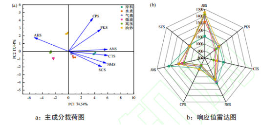 為比較不同烹飪方式對芫根整體滋味的影響,對樣品進行電子舌分析,結果如圖3所示。電子舌主成分分析中,第一主成分(PC1)和第二主成分(PC2)的貢獻率分別為74.54%和17.44%,總貢獻率達91.98%,已超過85%,說明這兩個主成分涵蓋了絕大多數樣品信息,可以用來表征芫根的滋味特征。主成分載荷圖中,以散點代表各個樣品,距離越近,表明樣本滋味相似度越高,對主成分貢獻大的影響因子以射線形式表示出來,影響因子越靠近樣品表明對相應樣品影響越大。6種芫根樣品分散區域明顯,表明電子舌能夠較好的區分不同烹飪方式的芫根。新鮮芫根與其他5種芫根樣品距離較遠,ANS和CTS傳感器對其影響較大,其中CTS傳感器對咸味具有特敏性,結合圖3b可知,新鮮芫根在ANS和鮮味特敏傳感器NMS上響應值較高,在咸味CTS和酸味AHS傳感器上響應值次之,烹飪后,鮮味NMS傳感器響應值減弱,咸味CTS響應值也明顯降低,酸味AHS響應值增強,說明烹飪處理會減弱芫根本身的咸鮮味,突出酸味。油炒的芫根整體響應值較大,與其他樣品距離較遠,說明油炒的與其他烹飪處理的芫根整體滋味差異較大,一方面是因為油炒溫度較高導致,另一方面食用油也會對芫根滋味產生影響。水煮和氣蒸的芫根在主成分圖中距離較近,說明這兩種方式烹飪的芫根整體滋味相似;同理可得微波和高壓烹飪的芫根滋味相似。