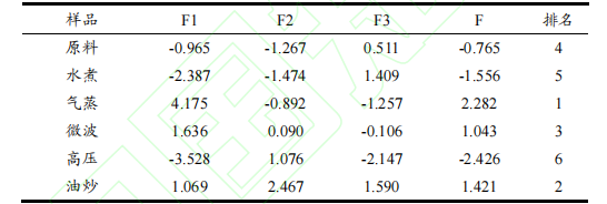 通過計算得到不同烹飪方式的芫根的綜合品質得分,得分高低反映芫根品質的高低,如表5所示,PC1中得分最高的是氣蒸芫根和油炒芫根,說明PC1對這兩種方式烹飪的芫根品質有較大影響;PC2中微波的芫根得分最高,說明ABTS抗氧化能力對其品質影響最大;PC3中新鮮芫根得分最高。根據綜合評分排名情況來看,不同烹飪方式處理后的芫根品質存在較大差異,氣蒸芫根綜合得分最高,其次是油炒芫根,高壓芫根得分最低。