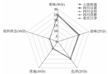 采用表1中花椒魚片的評分標準對不同產地青花椒制作的花椒魚片進行感官分析,結果見圖1。以四川洪雅青花椒為原料制作的花椒魚片評分最高,整體感官評分為81.6分,尤以花椒魚片的香味和滋味評分較高,但差異不顯著(P>0.05)。