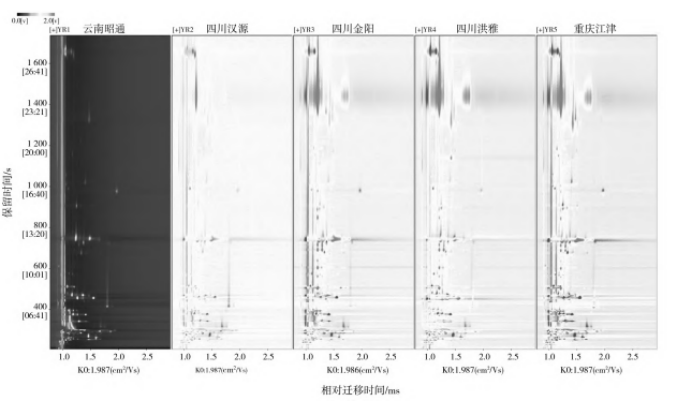花椒魚片樣品的揮發性物質GC-IMS三維圖譜見圖2。圖2中每個反應離子峰代表一種揮發性風味物質,顏色越深,表示物質越豐富。使用不同產地的青花椒制作花椒魚片時,可以直觀地看到四川金陽和重慶江津樣品組中風味物質的種類和濃度與其他樣品組差異較明顯。花椒魚片特征性風味成分GC-IMS差異譜圖見圖3,此圖是將圖2的三維圖投影到二維平面上的俯視圖,具體是以氣相色譜的保留時間作為縱坐標,以離子遷移時間作為橫坐標,以云南昭通青花椒樣品組譜圖為參比,將另外4個樣品組的譜圖扣減參比后得到的。差異圖譜中每個點代表一種揮發性風味物質。結果顯示,與云南昭通樣品組相比,四川金陽和重慶江津樣品組的風味物質濃度較高。