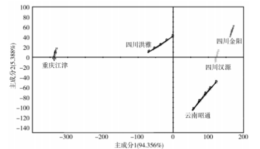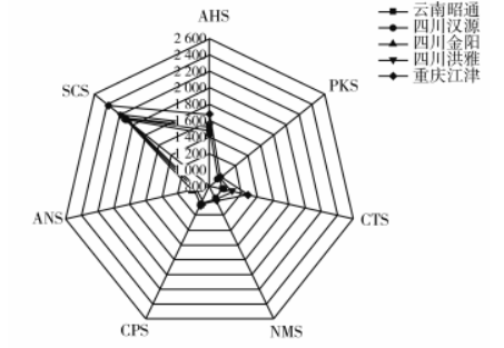 利用電子舌檢測儀自帶軟件對花椒魚片樣品的數據進行主成分分析(PCA),結果見圖5。主成分1和主成分2的貢獻率分別為94.356%和5.388%,總貢獻率達99.744%,超過85%,表明這兩個主成分涵蓋了大多數樣品信息,可以用來表征花椒魚片樣品的滋味特征。5種樣品散點區域分散明顯,表明電子舌能夠較好地區分不同產地的花椒魚片。由圖5可知,重慶江津樣品組與其他4組樣品的滋味差異最大。由圖6可知,花椒魚片在傳感器SCS、AHS、CTS、NMS上響應值較高,其中AHS、CTS、NMS分別為酸味、咸味、鮮味專一性傳感器,SCS為非專一性傳感器。差異性最大的SCS傳感器可能和青花椒中麻味物質含量的高低有關,其中重慶江津樣品組的響應值最大。