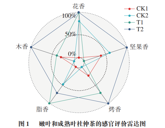 4 種處理下杜仲茶的香氣屬性描述詞上的平均得分如圖1所示,整體上香氣屬性得分排序為T2>T1>CK2>CK1。經蒸汽爆破處理后,嫩葉和成熟葉茶的香氣在感官上都有顯著提升,T2除脂香稍弱于T1,木香、花香、堅果香均較顯著;T1在脂香、花香表現較好,其次還伴有烤香。