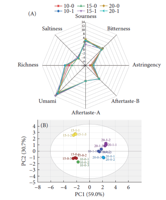 樣品感官評分最高的是20-1組,得分為31.5。感官評分表明,15-1組和20-1組的顏色得分均低于對照組,這可能是由于樣品隨著烤制時間的增加而變暗。結果表明,孜然的加入可以改善鮮味,增加孜然的特征香氣,掩蓋異味,改善酯香氣。