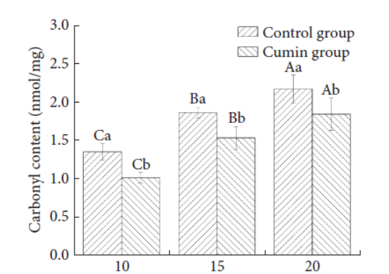 圖4 孜然對烤羊肉餅中羰基含量的影響