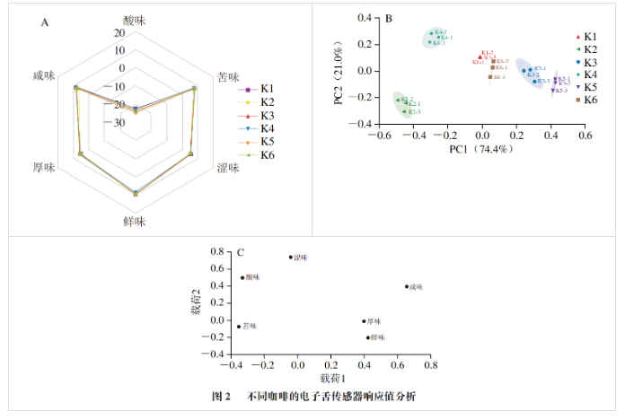 02 不同咖啡的滋味輪廓分析利用電子舌快速分析滋味輪廓,如圖2A所示。6種樣品的雷達圖輪廓類似,只有酸味傳感器的響應值為負,說明酸味對咖啡整體滋味的貢獻較小。各樣品在鮮味與咸味傳感器上的響應值差異最大,表明這兩種傳感器對滋味特征的區分效果最好。為根據滋味特征進一步區分6種咖啡,對電子舌傳感器響應值結果進行PCA(圖2B)。6種咖啡輪廓未重疊,滋味特征明顯,易被區分。K3、K5和K6咖啡在PC1的正方向,主要受鮮味、咸味、厚味影響;K1、K2和K4咖啡在PC1的負方向,主要由澀味、酸味、苦味影響(圖2C)。每個樣品聚類的距離與滋味特征接近度相關,有相同咖啡配比的K1~K4樣品,烘焙程度不同,距離較遠,說明電子舌可以區分不同烘焙度的咖啡。K5、K6咖啡分別與K1、K3咖啡輪廓接近,說明不同的咖啡配比在一定程度上能夠彌補烘焙程度的差異,使不同烘焙度的咖啡具有類似的滋味輪廓。