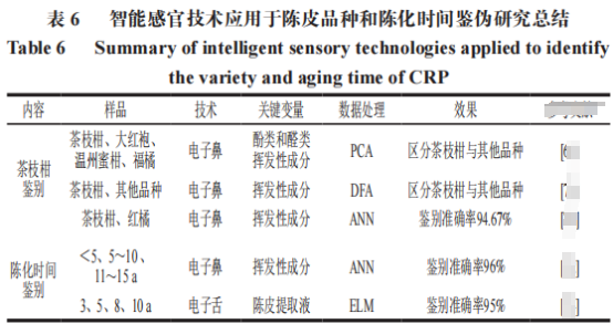 智能感官技術(shù)作為新興的快速分析技術(shù),采用電子傳感器模擬生物的嗅覺及味覺系統(tǒng),從而使樣品的檢測客觀化、智能化。其中的電子鼻和電子舌技術(shù)應(yīng)用于陳皮品種和陳化時間鑒偽的研究總結(jié)見下表。