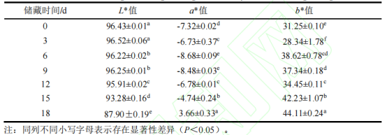 由表2可知,在貯藏18d后,漿水青稞奶茶色度整體呈現(xiàn)出L*值降低、a*值及b*值增加的現(xiàn)象,反映在感官上表現(xiàn)為奶茶光澤下降,色澤變紅、變褐,且時(shí)間越長(zhǎng),顏色變化越明顯。