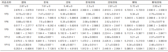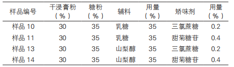 表1 三氯蔗糖與輔料矯味組合味覺(jué)信息測(cè)定值的均值 ± 標(biāo)準(zhǔn)差、95% 置信區(qū)間表2甜菊糖苷與輔料矯味組合味覺(jué)信息測(cè)定值的均值 ± 標(biāo)準(zhǔn)差、95% 置信區(qū)間表3阿斯巴甜與輔料矯味組合味覺(jué)信息測(cè)定值的均值 ± 標(biāo)準(zhǔn)差、95% 置信區(qū)間根據(jù)表1~3,選出甜味、鮮味、鮮味回味較高值的樣品,苦味、苦味回味、澀味、澀味回味較低值的樣品,即選出樣品 10、11、13、14 共 4 個(gè)樣品作為進(jìn)一步研究的對(duì)象,篩選結(jié)果見(jiàn)表4。