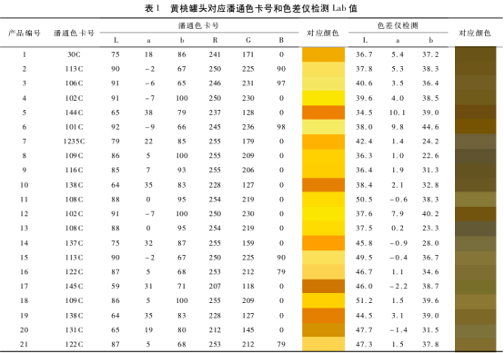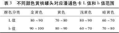 為了減少其他因素的干擾如品牌、價格、廣告、經驗等方面的影響,本實驗決定采用雙盲法進行檢驗。所有的樣品都用3個隨機的數(shù)字進行編碼,檢驗樣品也隨機化。在進行試驗之前罐頭要先打開5min,再將桃片放在白色瓷盤上。由訓練型評價員以潘通色卡為參比物,尋找和黃桃罐頭相對應的色卡,記錄下其Lab值和RGB值,然后再由訓練型評價員根據(jù)經驗,按照金黃色、黃色、淺黃色、暗黃色將其分為四類。