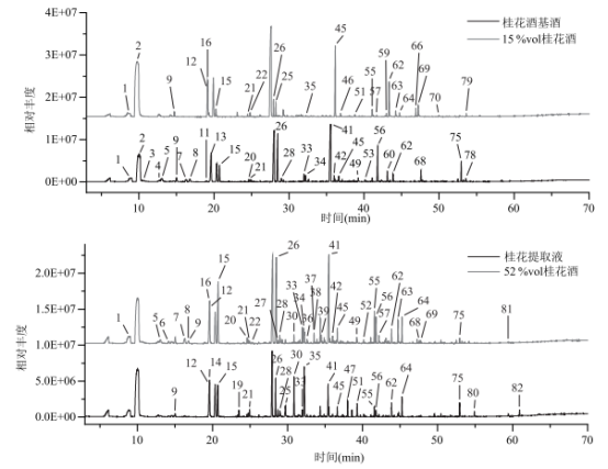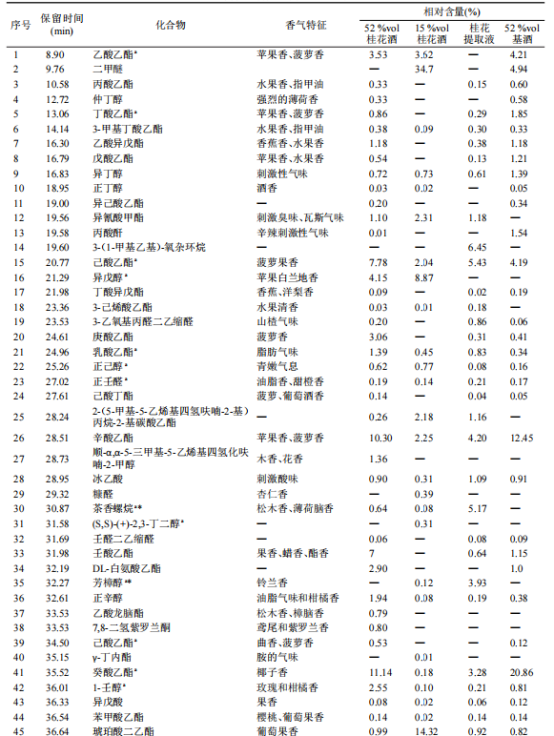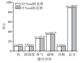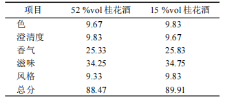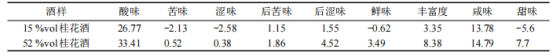 將自制52%vol桂花酒與市售15%vol桂花酒進行人工感官對比評定,取平均分,結果見表2。由表2可看出,自制52%vol桂花酒在澄清度及酒體豐富度方面表現(xiàn)更好,市售15%vol桂花酒的香氣與滋味得分較高,且酒體風格更具優(yōu)勢,說明52%vol桂花酒香味更加豐富飽滿,15%vol桂花酒的桂花風格更加典型。