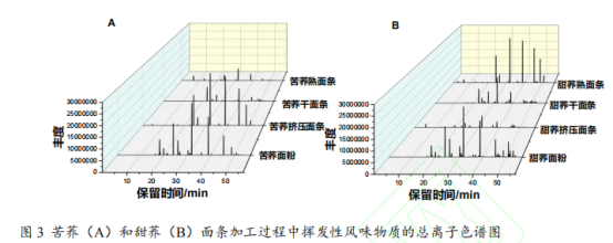 以上研究表明,擠壓加工及熱風(fēng)烘干可以促進(jìn)蕎麥面條風(fēng)味的形成,特別是熱風(fēng)干燥,其中全苦蕎面條風(fēng)味更加濃郁。